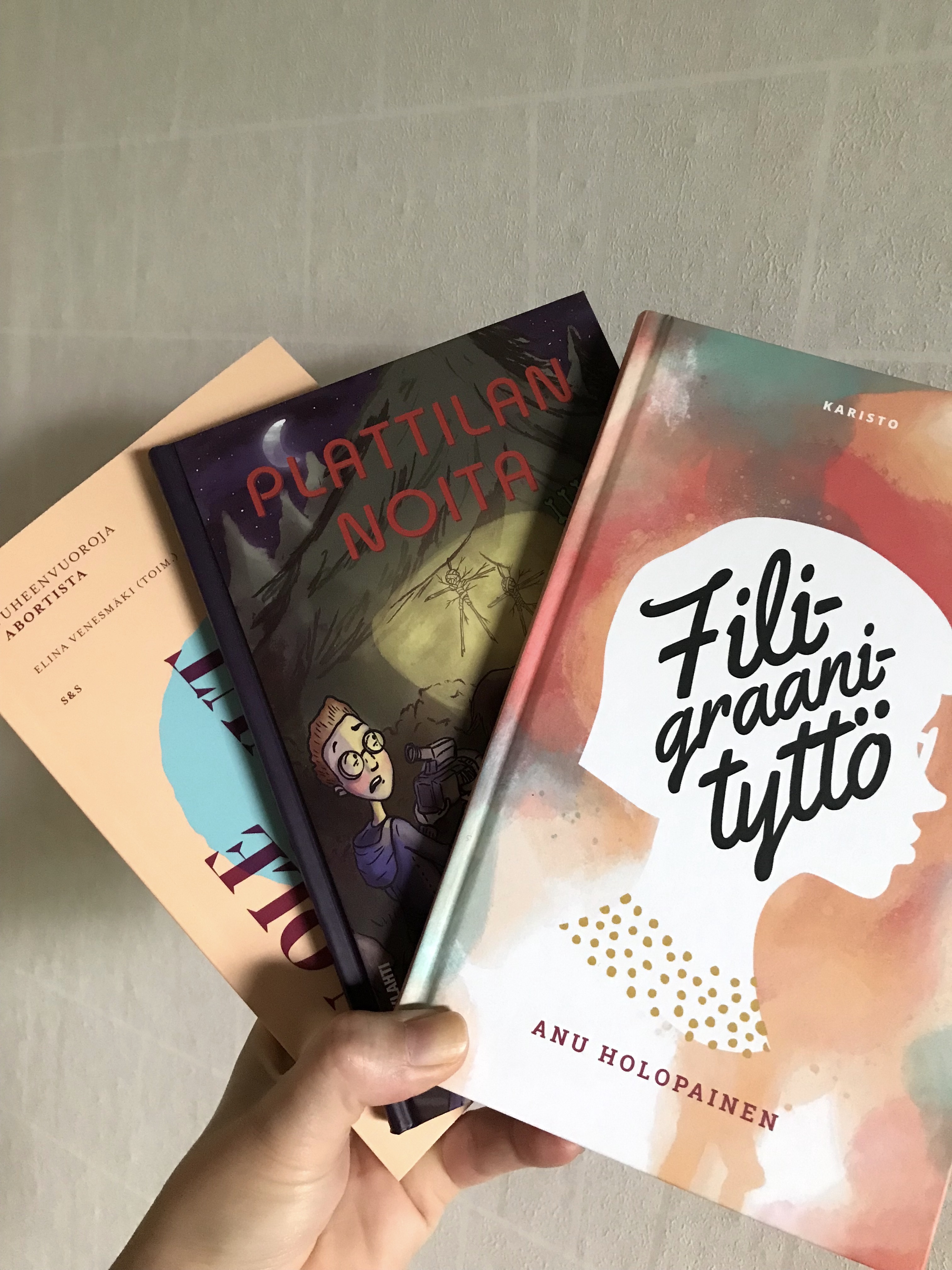 Kevään mittaan ilmestyivät myös kolme neljästä edellisen postauksen kirjoista: IIK!-sarjan 5. osa Plattilan noita, nuortenromaani Filigraanityttö sekä aborttia käsittelevä tietokirja En ole kertonut tästä kenellekään. Novellikokoelman Likainen tusina taitto on käynyt jo jokin aika sitten tarkistettavana, joten sekin ehtinee kauppojen ja kirjastojen hyllyille aikataulussa aivan tuotapikaa.